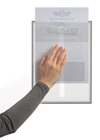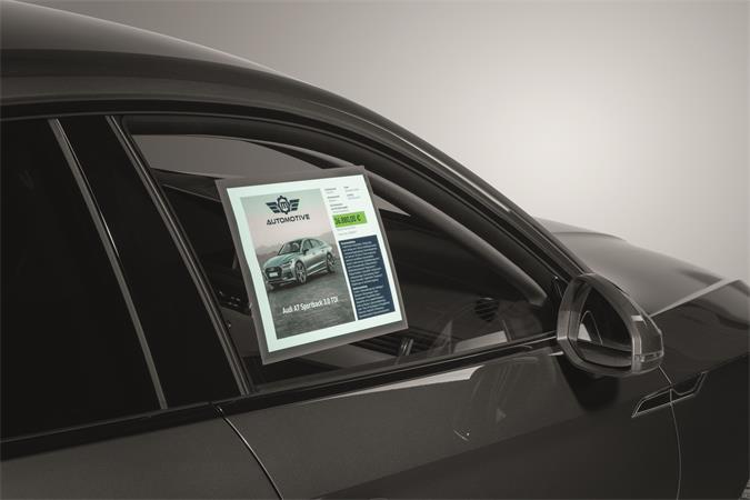 Feliratozási megoldás ívelt üvegfelületek számára: A statikusan tapadó dokumentumtartók alkalmasak arra, hogy ajánlatokat helyezzünk ki velük az autó ablakaira, kirakatokba, vagy kínáló pultok üveg felületeire.