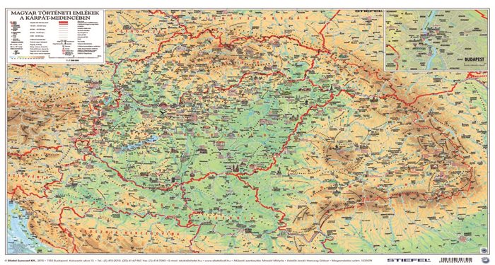 A térkép a magyar történelmi emlékhelyeket és a magyar nemzeti kincseket veszi számba. A Kárpát-medence legismertebb látványosságait színes akvarell rajzok elevenítik meg. A negyvennyolcas és a Rákóczi-szabadságharc emlékhelyeit is bemutató térkép a jelentős búcsújáróhelyeket, templomokat piktogrammal ábrázolja. A jelenlegi közép-európai országhatárok mellett vékonyabb vonallal feltüntettük a történelmi Magyarország határát is.