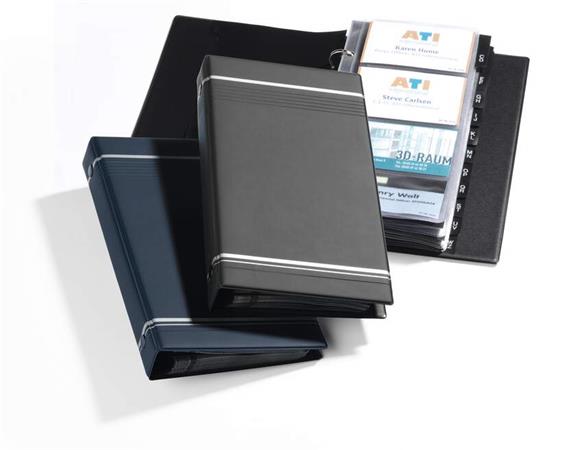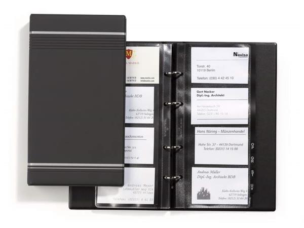 Névjegykártya gyűrűskönyv, matt felülettel, ezüst díszcsíkokkal.