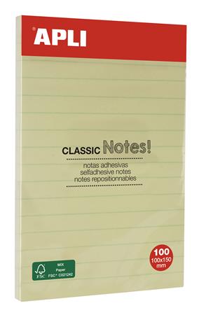 Öntapadó jegyzettömb, vonalas, 100x150 mm, 100 lap, APLI "Classic", sárga