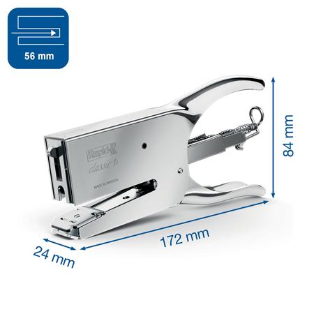 A kiváló minőségű és tartós Rapid Classic K1+ kézi tűzőgépet több mint 80 éve gyártják, Svédországban. Ez az ikonikus kialakítású eszköz kopásálló acélból készült, ergonomikus markolattal, amely kényelmes egykezes tűzést tesz lehetővé akár 50 darab 80 g/m2-os papírlap esetében is.