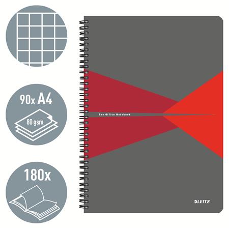 Spirálfüzet, A4, kockás, 90 lap, laminált karton borító, LEITZ "Office", szürke-piros