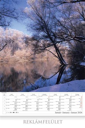 -naptár rész: magyar, angol, német nyelven, magyar  ünnepek  és névnapokkal, napkelte, napnyugta és holdállás  feltüntetésével
