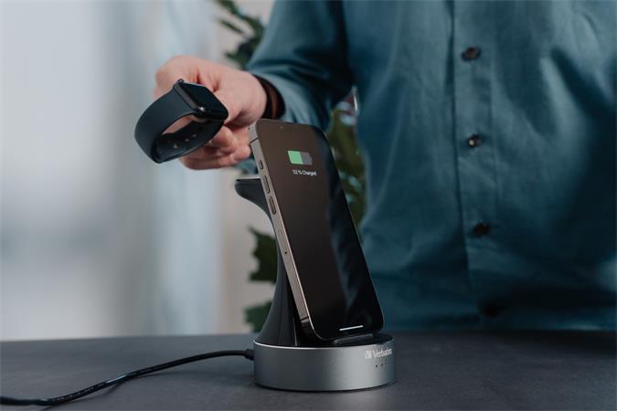 Töltse fel Apple Watch-ját és iPhone-ját (8-as vagy újabb) vagy más, Qi-tanúsítvánnyal rendelkező vezeték nélküli töltésre alkalmas eszközét a Verbatim 2 az 1-ben töltőállomásával.