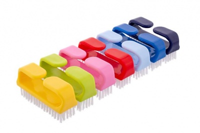 Markolattal ellátott műanyag körömkefe, műanyag szálakkal.