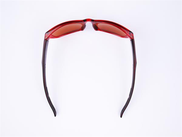 Sportnapszemüveg borostyánszínű HD lencsével, meggypiros-fekete műanyag kerettel.