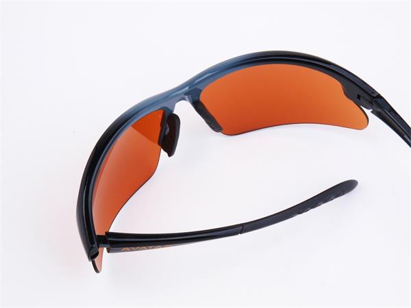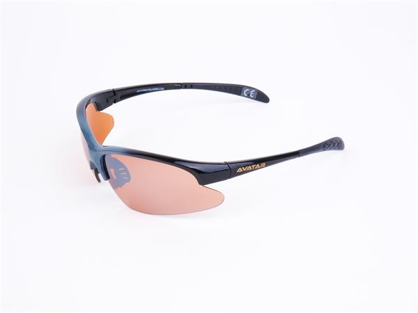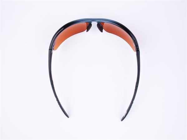 Sportnapszemüveg borostyánszínű HD lencsével, fekete-szürke műanyag kerettel.